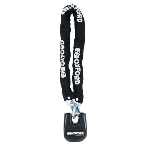 Lucchetto a catena pesante da 1,5 m in acciaio legato Ni-Cro-Mo da 12 mm con lucchetto Monster rinforzato. Include una manica in tessuto per proteggere la vernice e una valutazione Sold Secure GOLD per motociclette. Include 3 chiavi e servizio di sostituzione delle chiavi.